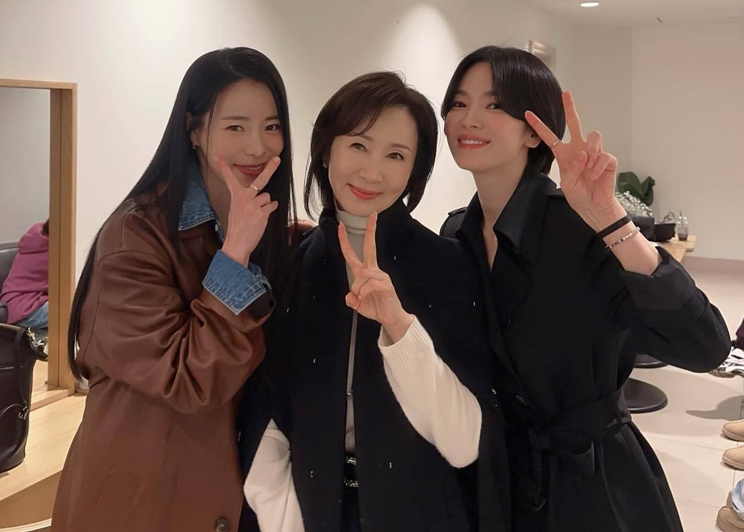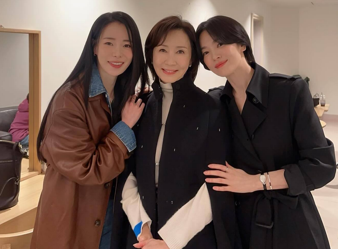这是宋慧乔跟林智妍、钱忍和前辈一起相聚时的合照,她们也一起合照。宋慧乔和林智妍都站在前辈两边,两人都靠向前辈,样子像是在撒娇,十分有趣。